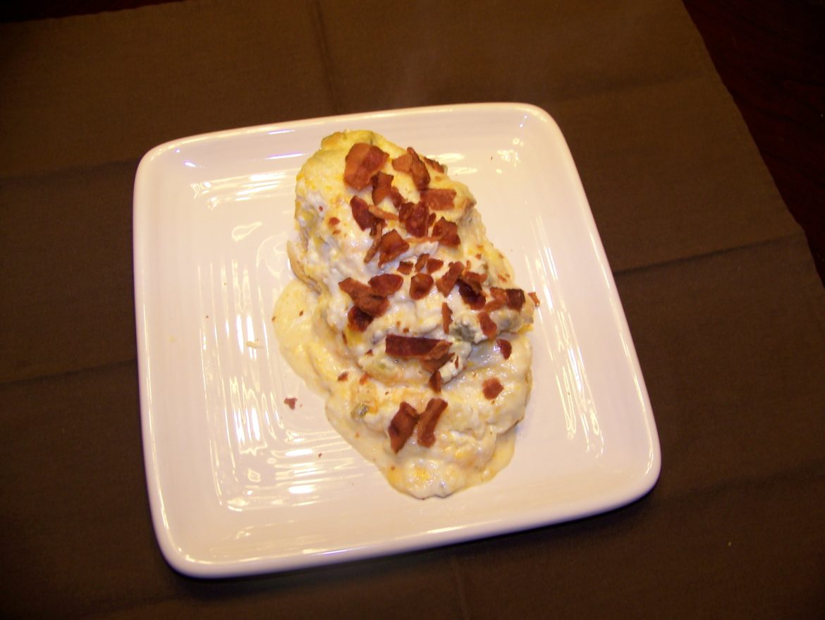 1 cup cream cheese 6 Jalapeno peppers (3-4 tablespoons diced or chopped peppers to taste) 2 cups mixed mozzarella & cheddar ¾ cup heavy whipping cream 4 chicken breasts Sliced cheddar cheese Thinly cut bacon, cooked until crisp